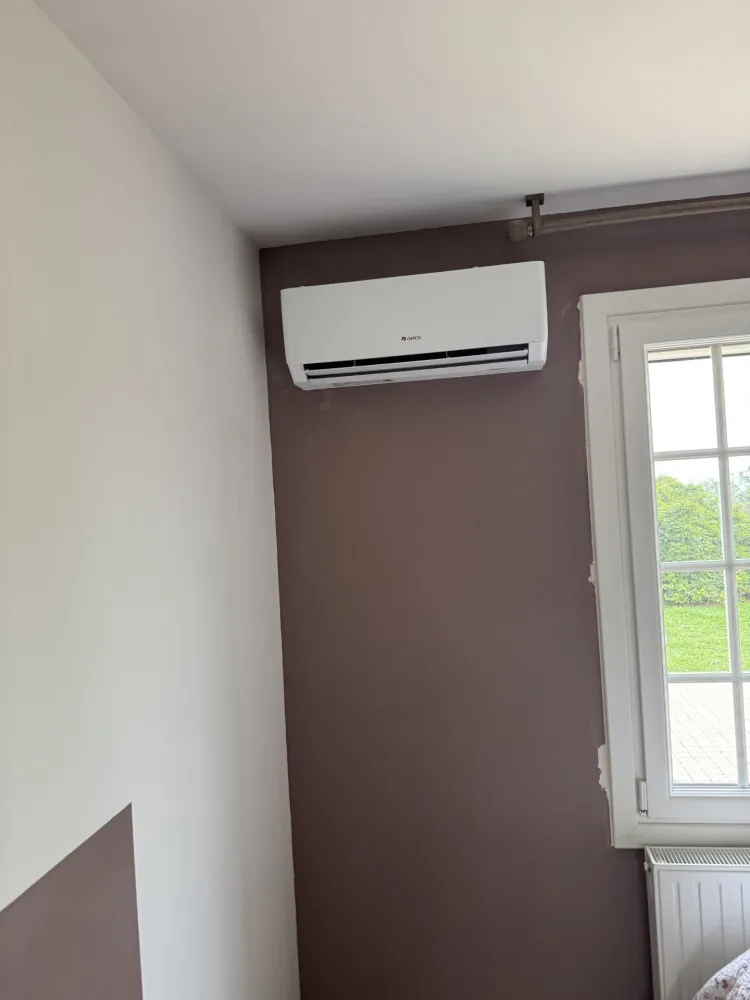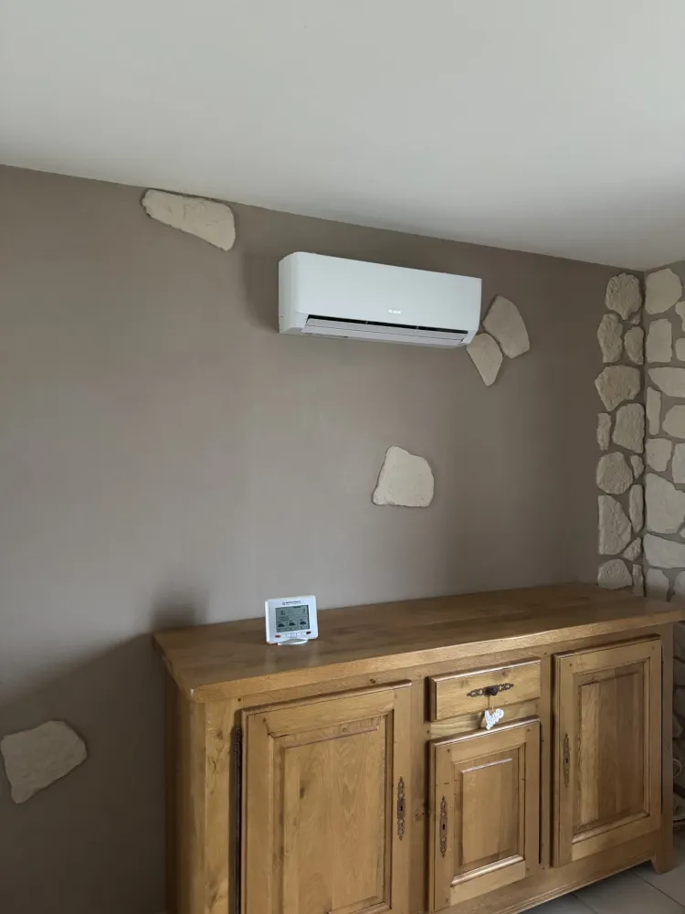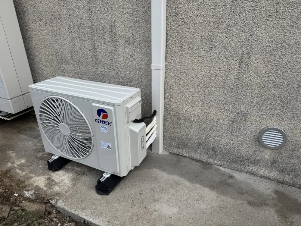 Découvrez un exemple de réalisation avec la pose d’un tri-split de marque GREE, avec évacuation gravitaire et intégration soignée pour un rendu très discret.